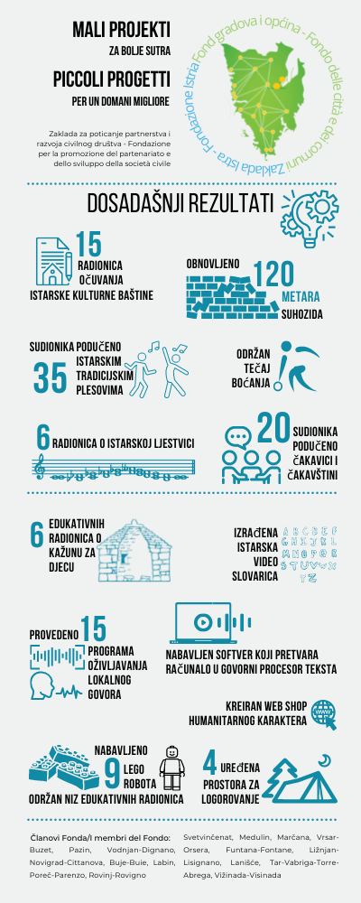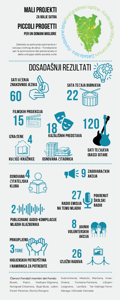 Infografika sažima rezultate višegodišnje provedbe natječaja za male projekte u zajednici “Mali projekti za bolje sutra”.