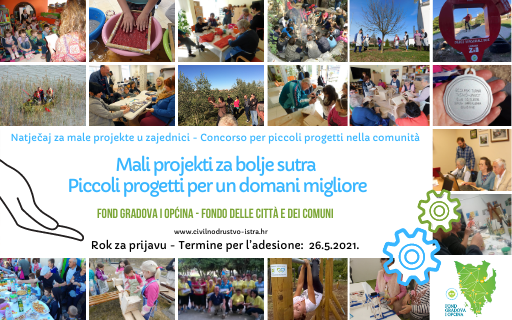 Zaklada za poticanje partnerstva i razvoja civilnog društva raspisala je Natječaj za male projekte u zajednici „Mali projekti za bolje sutra“. Projekte na ovaj natječaj uz udruge, mogu podnijeti i ustanove te mjesni odbori, važno je da je sjedište prijavitelja registrirano u gradovima i općinama koji su članovi Fonda gradova i općina: Buje, Buzet, Funtana, Labin, Lanišće, Ližnjan, Marčana, Medulin, Novigrad, Pazin, Poreč, Rovinj, Svetvinčenat, Vodnjan i Vrsar.