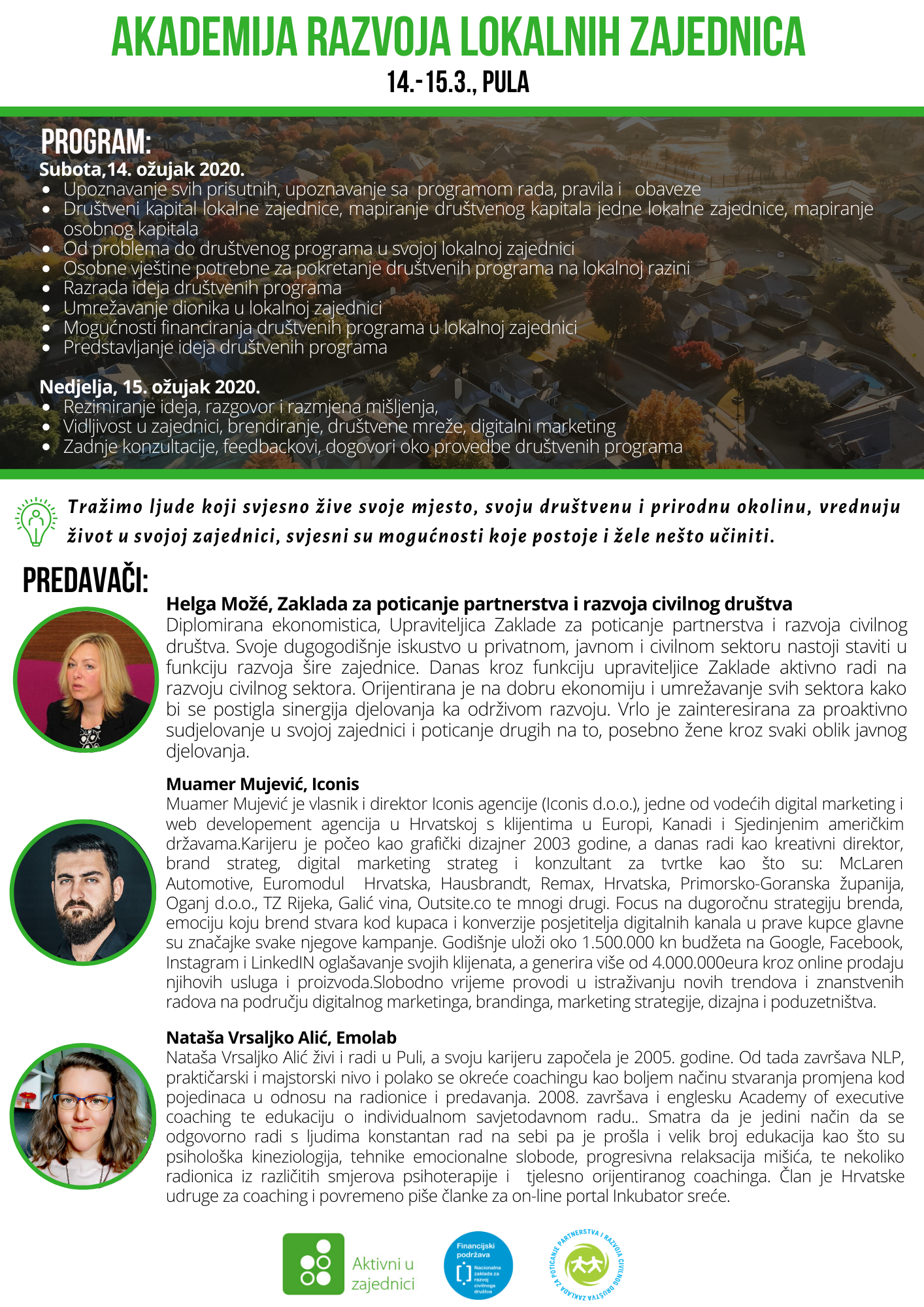 Motivirane osobe koje žele doprinijeti društvenim promjenama u svojoj lokalnoj zajednici, pokrećući društvene programe i projekte. Godine nisu važne, spol nije važan, zaposlenje nije važno, boja kože nije važna, vjeroispovijest nije važna, politička uvjerenja nisu važna. Važno je da želite doprinijeti razvoju mjesta u kojem živite. Važno je da živite na području: Istarske, Primorsko goranske, Karlovačke, Sisačko-moslavačke ili Krapinsko-zagorske županije. Važno je da želite steći više praktičnih znanja i vještina potrebnih za aktivan doprinos zajednici u kojoj živite ali i za osobni rast i razvoj.
