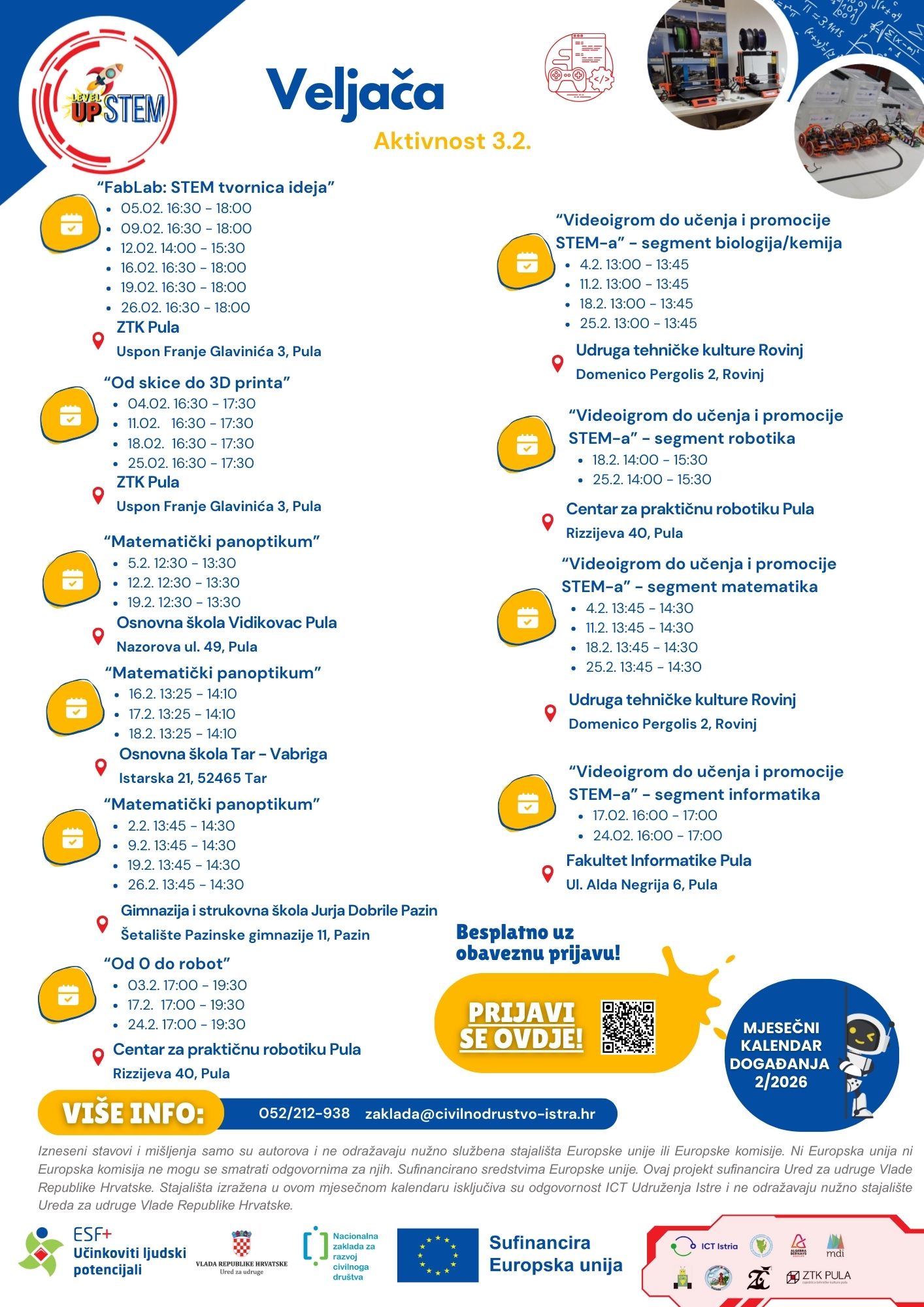 Svaki mjesec objavljujemo mjesečni kalendar događanja, koji možete pratiti na našim mrežnim stranicama te na stranicama nositelja i partnera projekta. Na kalendaru se nalazi i poveznica za prijavu na radionice – prijavite se na vrijeme jer je broj mjesta ograničen!